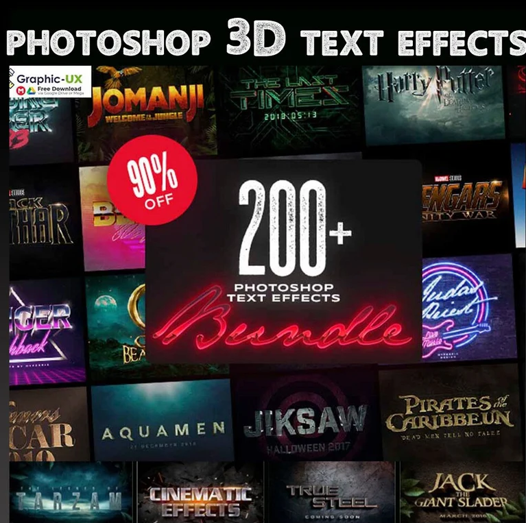 205 Photoshop Text Effects Included In This Bundle: • 80s Text Effects (28 PSD Files) • Cnematic Text Effects (94 PSD Files) • Cartoon Text Effects (8 PSD Files) • Game Logo Text Effects (8 PSD Files) • Chalkboard Text Effects (8 PSD Files) • Vintage Letterpress Text Effects (20 PSD Files) • Watercolor Text Effects (10 PSD Files) • 3D Text Effects (5 PSD Files) • 3D Gold Text Effects (24 PSD Files) ❗❗❗❗ File Format ❗❗❗❗ Format : PSD Total File : 205 File Size : 5.7GB